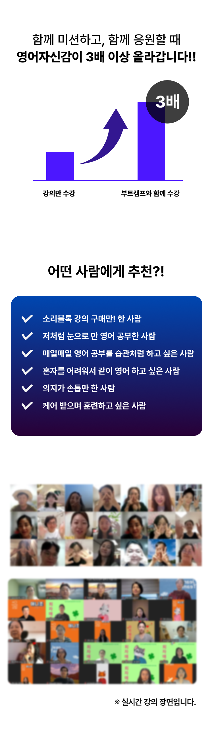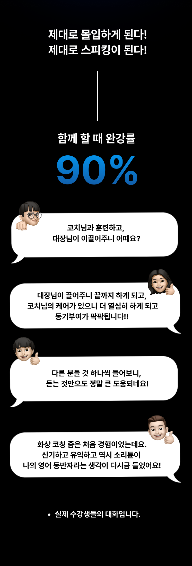 지금 시작한지 일주일되었는데 확실히 다른 온라인강의랑은 튼려요. 잘내뱉을수있으리란 기대감이 생겨요. 다들 서로 으샤으샤해주고 하는걸 보게되니 귀찮거나 빼먹고싶을때도 막상 들어가서 수업을하게 됩니다. 스피킹수업 유목민이었는데 이제 정착할수있게되서 너무 좋아요