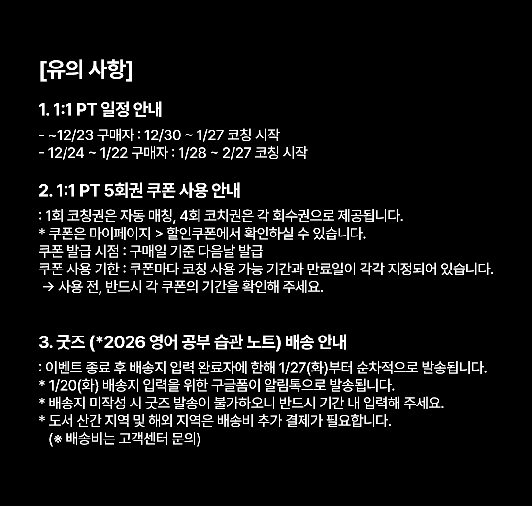 - 상단의 1. 일반VOD와 2. 1:1PT 코칭권과 동일하게 따릅니다.